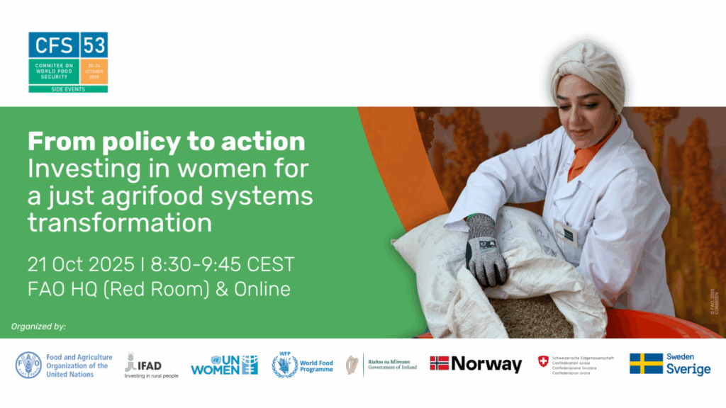 Channelling investments and fostering partnerships to enable rural women to secure their livelihoods, rights, and resilience is key to building a better future for the people and the planet. This event highlights initiatives focused on sustainable investments and partnerships for food security and nutrition under the Joint Programme on Rural Women’s Economic Empowerment (JP RWEE) and FAO’s Commit to Grow Equality (CGE) initiative.