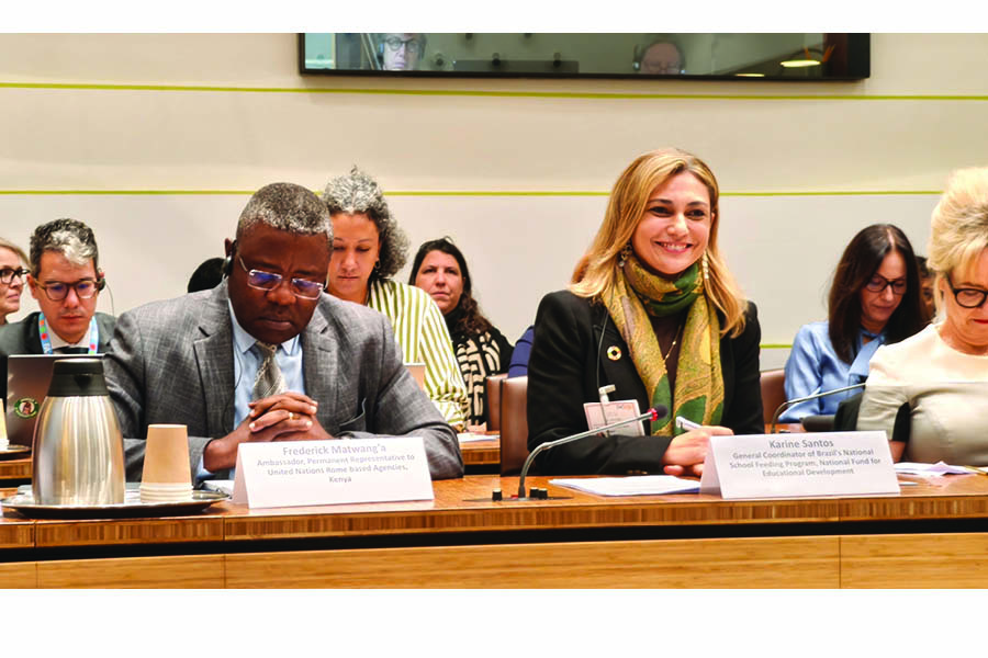 Ambassador Frederick Mwang’a (left), ambassador, permanent representative to United Nations Rome based agencies, and Karina Santos (right), general coordinator of Brazil’s National School Feeding Programme, National Fund for Educational Development.