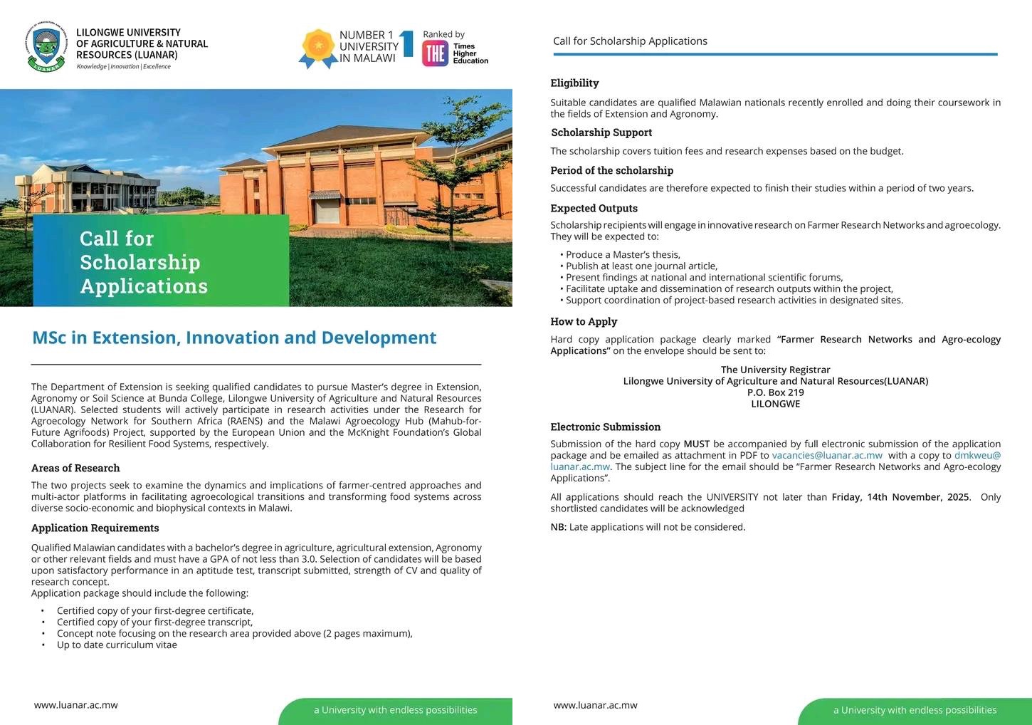 Lilongwe University of Agriculture and Natural Resources (LUANAR) is seeking qualified candidates to pursue Master’s degree in Extension, Agronomy or Soil Science at Bunda College, Lilongwe University of Agriculture and Natural Resources (LUANAR). Selected students will actively participate in research activities under the Research for Agroecology Network for Southern Africa (RAENS) and the Malawi Agroecology Hub (Mahub-for-Future Agrifoods) Project, supported by the European Union and the McKnight Foundation’s Global Collaboration for Resilient Food Systems, respectively.